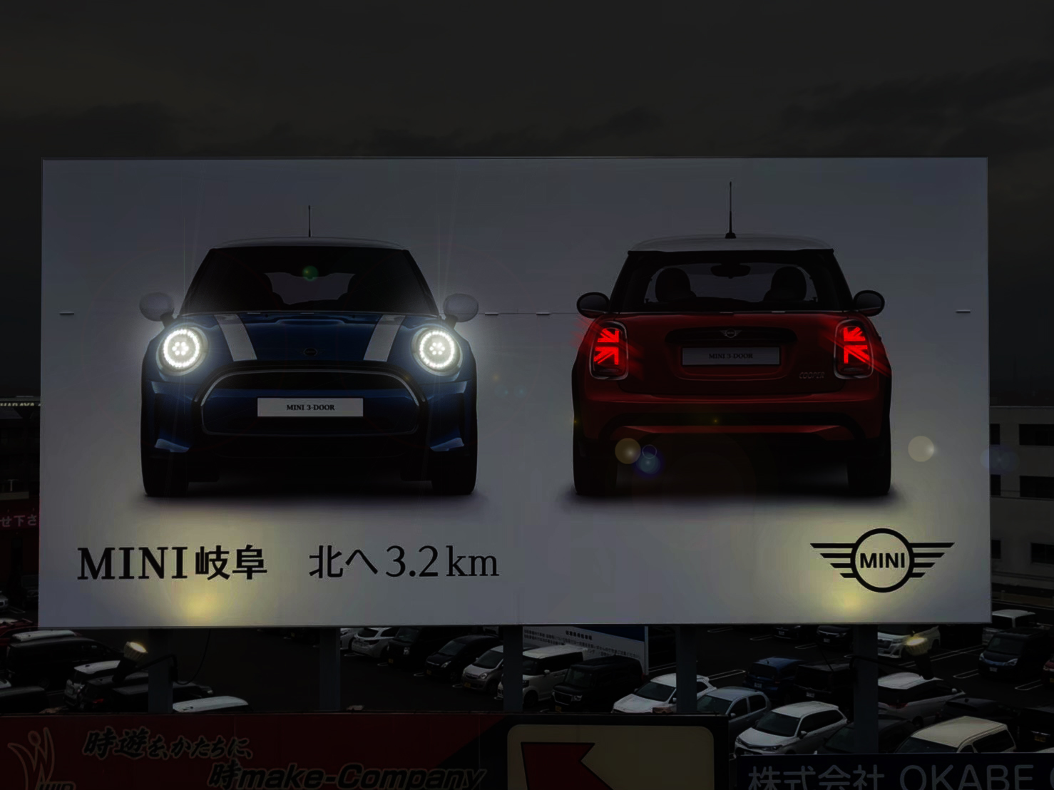 通常、看板全体を照らすことの多い照明設備ですが、今回は車のヘッドライト・テールライトを部分発光させるデザインプランにて製作しました。 今回特にこだわったのがMINI独自のユニオンジャックをモチーフとしたテールライトの表現方法です。実車同様にユニオンジャックを表現させるために様々な試行錯誤を繰り返しました。 LEDを使用した新しい表現方法で、訴求力の高いロードサインです。
