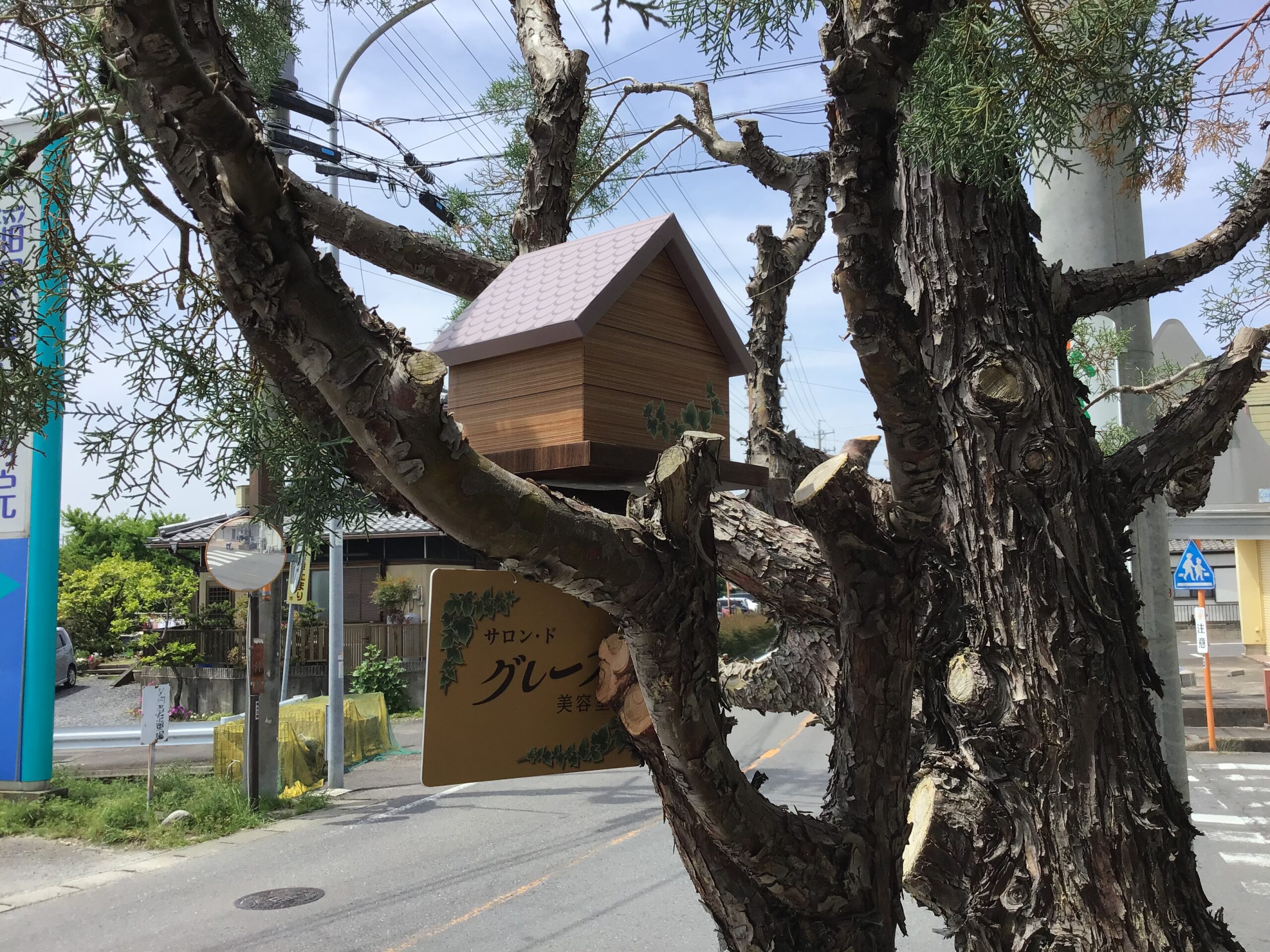 店舗前の木に鳥の巣箱風の店名サインを取り付けました。 既成品ではなくオリジナルのデザインで制作しました。 さり気なく、且つ個性的な店名サインになっています。