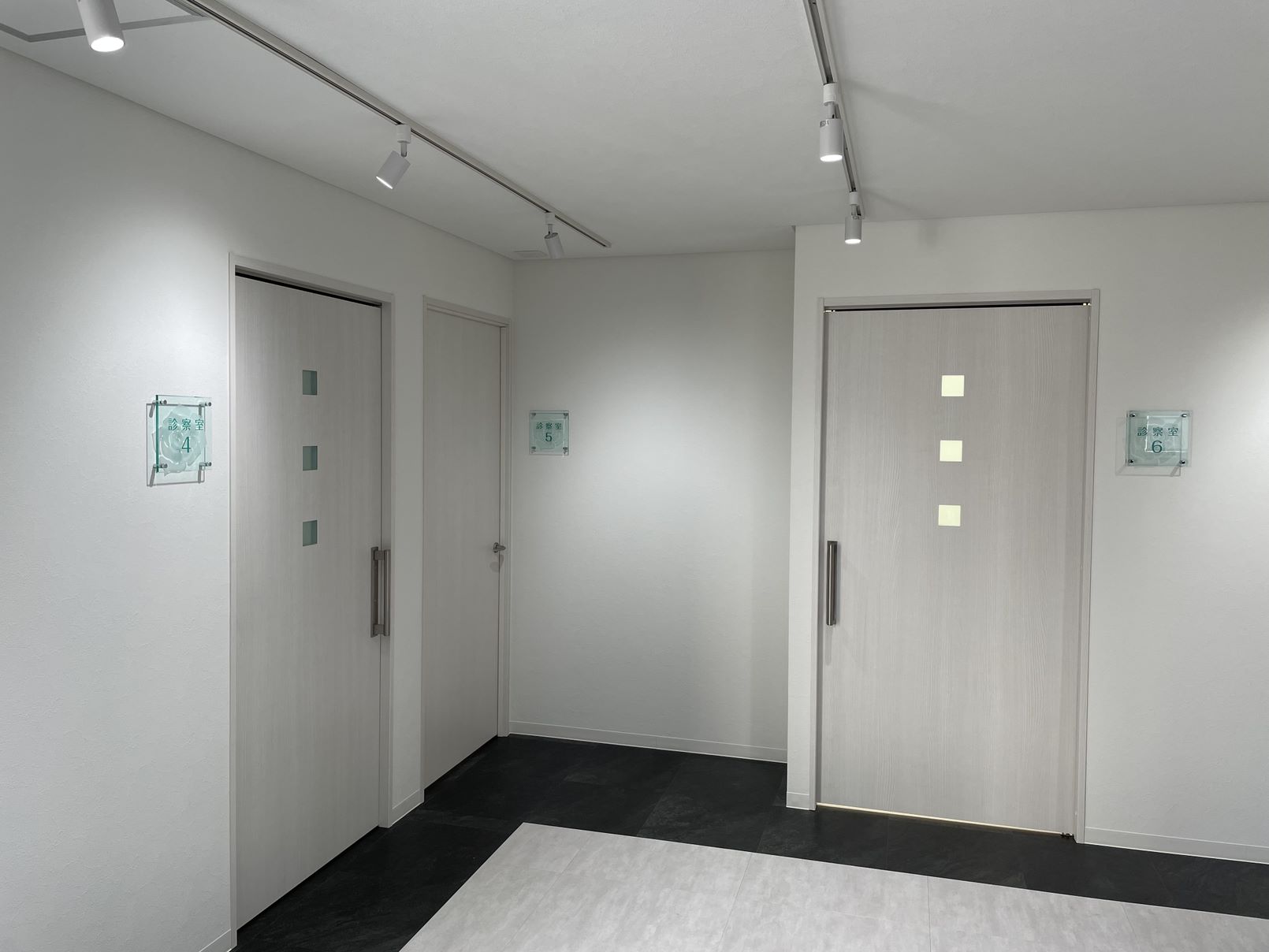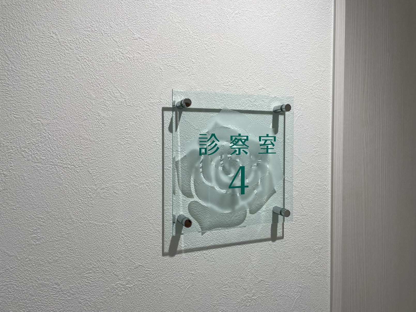 クリニックは白を基調としたシンプルで清潔感がある外観なので、サインは溶け込みすぎないように計画しました。 院名文字サインもあえて大きめにサイズ設定し、離れた位置からでも認識できるようにしました。 院内も白を基調としていますが、逆に院内サインはガラス色のアクリルプレートを採用し 内装に溶け込むようデザインしています。