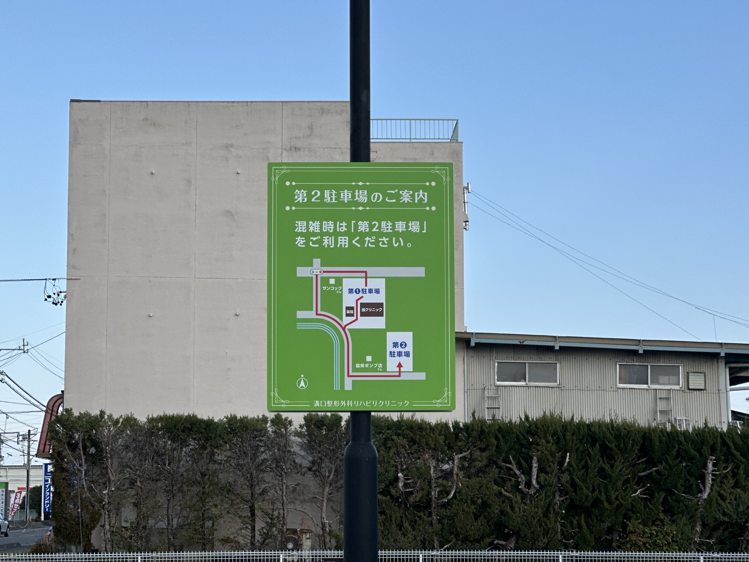 岐阜県瑞穂市にある溝口整形外科リハビリクリニック様の駐車場案内看板を設置しました。 駐車場内の外灯支柱に取り付けを行いました。 自立タイプの看板設置も検討しましたが、駐車時の支障や事故等のリスクも考慮して 既設外灯支柱を併用するプランをご提案し、結果的に省スペースで認知もしやすい看板を設置することができました。