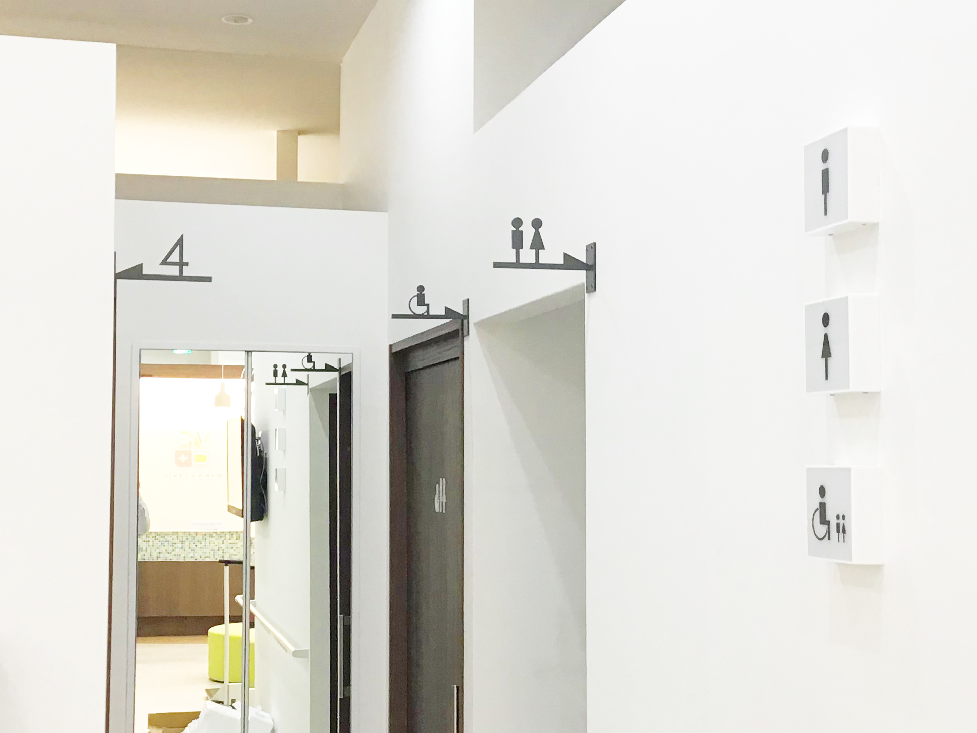 WAKA 糖尿病・甲状腺クリニックのクリニック内は、シンプルなインテリアに合わせて敢えて飾り過ぎないデザインとしました。通常は板面で製作する室名サインは、数字やピクトを立体的に切り抜き視認性とデザイン性を両立させています。