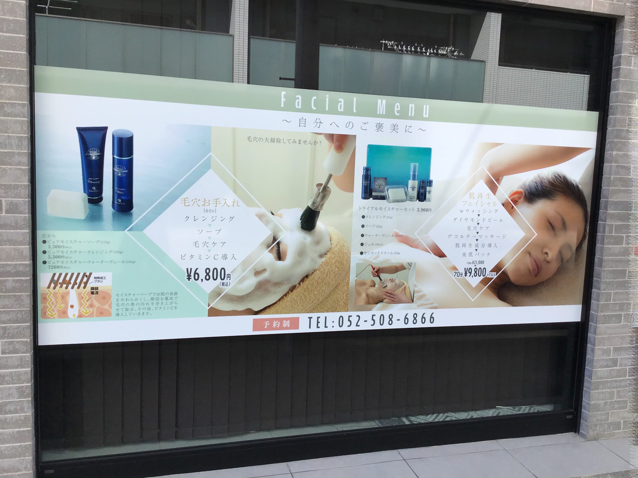 元々ガラス面はロゴのみのデザインでしたが、「詳細なメニューと写真を使用し、集客力を上げたい」という要望を受け、サインプランニングをしました。 流行に敏感な幅広い年齢層をターゲットとする為、「こんな私に出会えるなんて」というコピーを考案し、そのコピーを基にサイン全体のアイデアを膨らませデザインしました。